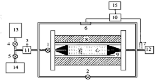 1、2、3、4、5阀门;6、差压传感器;7、CY201;8、径向围压;9、轴向围压;10、数字电压表;11、12上下游标准室;13、真空泵、14、平流泵;15、计算机及接口路线选用理由→CY201以其高精度、高稳定性弥补了模拟传感器精度低,测试不稳定的缺陷。